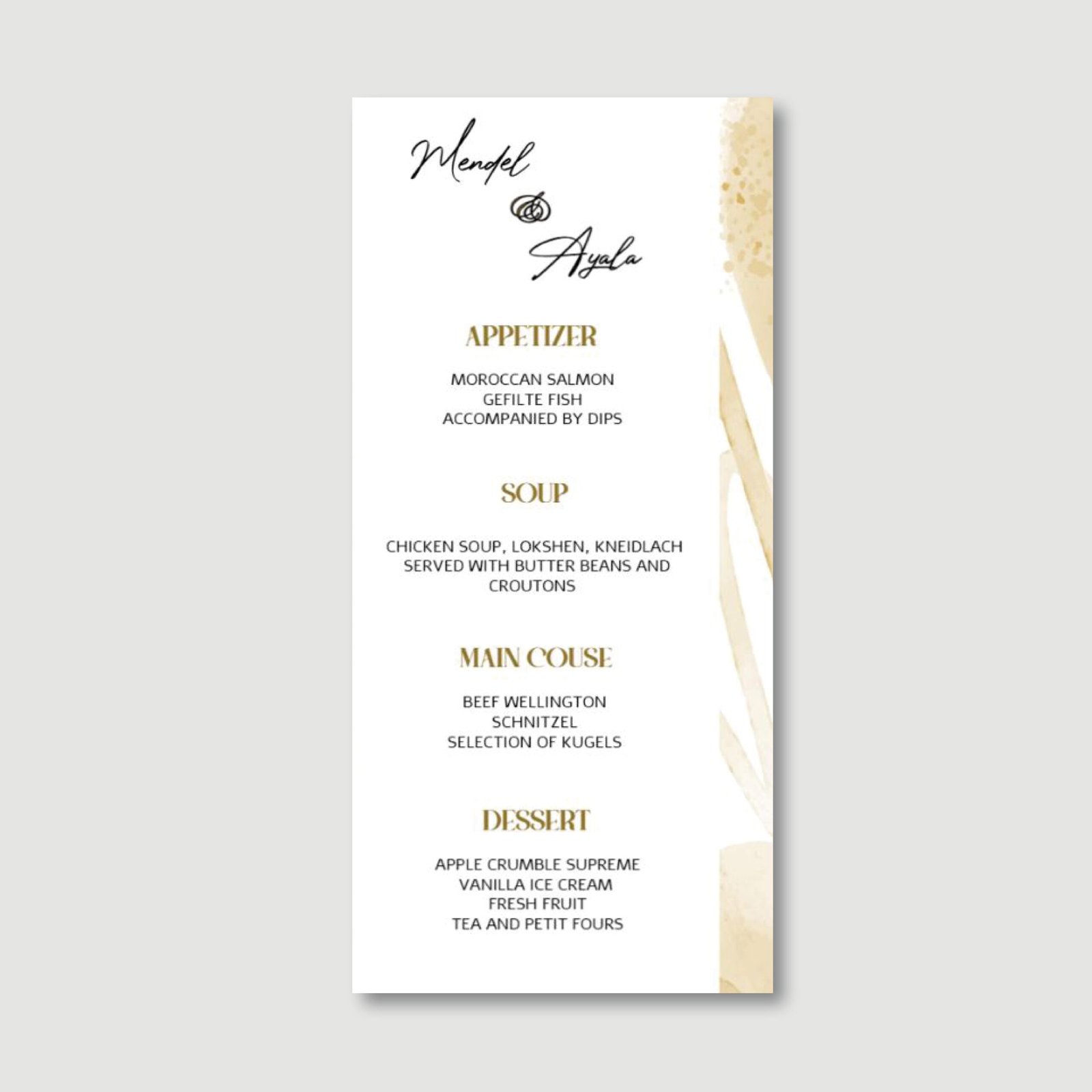 Our elegant menu cards add a refined touch to each table setting, while offering guests a preview of what’s to come. Choose from a thoughtfully designed collection of templates—classic, modern, or somewhere in between—and personalize with your event details, courses, or a short message. Whether it’s a wedding, bar/bat mitzvah, or special dinner, our printed menus help set the scene with understated sophistication. No graphic designer required—just your personal touch.
