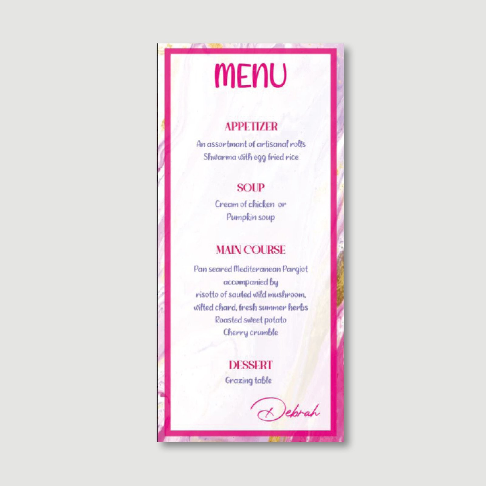 Our elegant menu cards add a refined touch to each table setting, while offering guests a preview of what’s to come. Choose from a thoughtfully designed collection of templates—classic, modern, or somewhere in between—and personalize with your event details, courses, or a short message. Whether it’s a wedding, bar/bat mitzvah, or special dinner, our printed menus help set the scene with understated sophistication. No graphic designer required—just your personal touch.